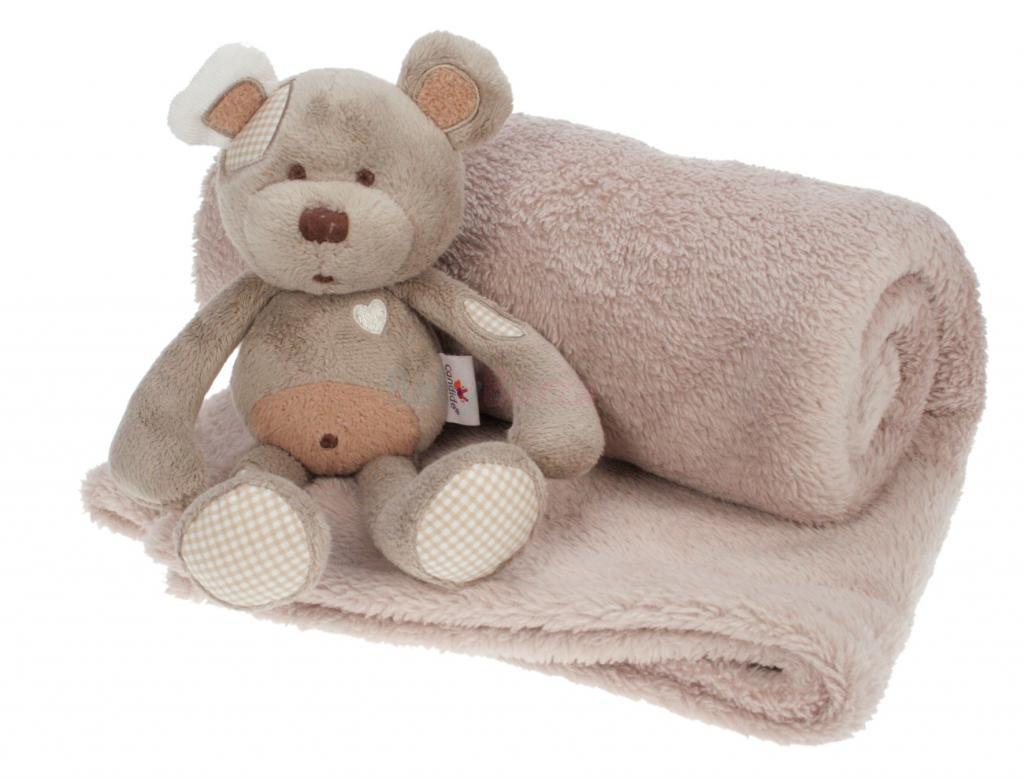 Plyšová deka o rozmere 70 x 105 cm. Z veľmi jemného a príjemného plyšového materiálu. Deku môžete využiť aj do kočíka alebo postieľky. Súčasťou je aj hnedý plyšový medvedík so srdiečkom. Jedno ucho má medvedík biele a druhé hnedé. Vyšité oči a nos. Medvedík je 24 cm vysoký.