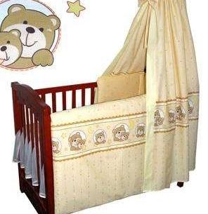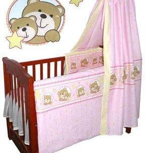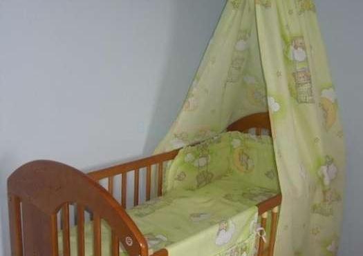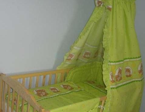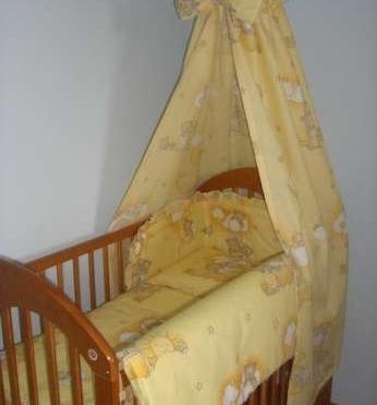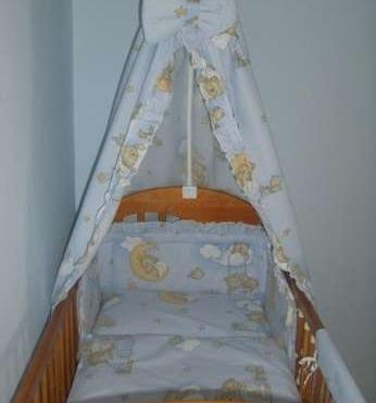 Materiál: 100% bavlna.Nový tovar.11 dielna súprava do postieľky obsahuje:1. obliečku na vankúš 40x60cm (Zapínanie na zips)2. obliečku na paplón 120x80cm (Zapínanie na zips)3. chránič za hlavičkou (S volánikmi)4. vankúš antialergický5. paplón antialergický6. látkový baldachýn nad postieľku s ozdobnou mašľou7. konštrukciu na baldachýn (vhodná na všetky typy postielok)8. vreckár9. plachtu na gumičku10. zavinovačku s kokosovou vložkou(vyberateľná), zapínanie na suchý zips a mašľu11. mini poduštičku (vhodná do kočíka, zavinovačky...)Súprava je vhodná do postieľky s rozmerom 120x60cm.
