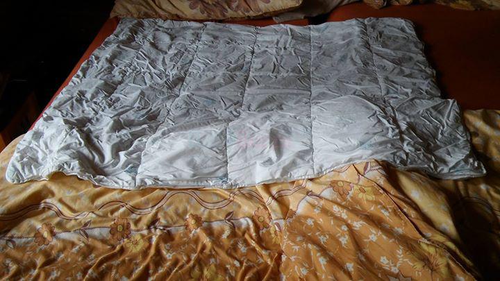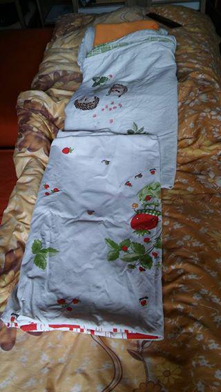 Predam paplon 125x110, 2 obliecky na tento paplon, 2 biele plachty 140x70, oranzova deka 90x90. Pouzivane 2 roky. Paplon je pratelny.