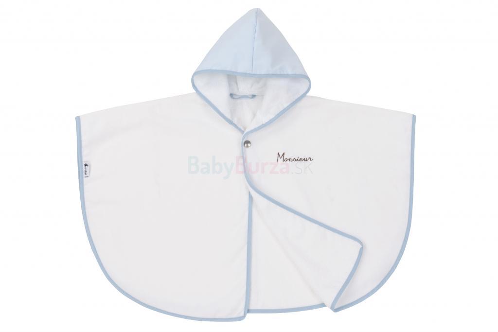 Poncho s modro lemovanými okrajmi v univerzálnej veľkosti. Poncho je z froté, ktoré je savé a zároveň veľmi jemné. Zopnutie na patent.