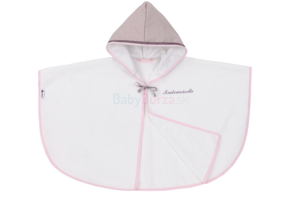 Poncho s ružovo lemovanými okrajmi v univerzálnej veľkosti. Poncho je z froté, ktoré je savé a zároveň veľmi jemné. Zopnutie na lesklú vínovú mašličku. Kapucňa je lemovaná vínovú stuhou.