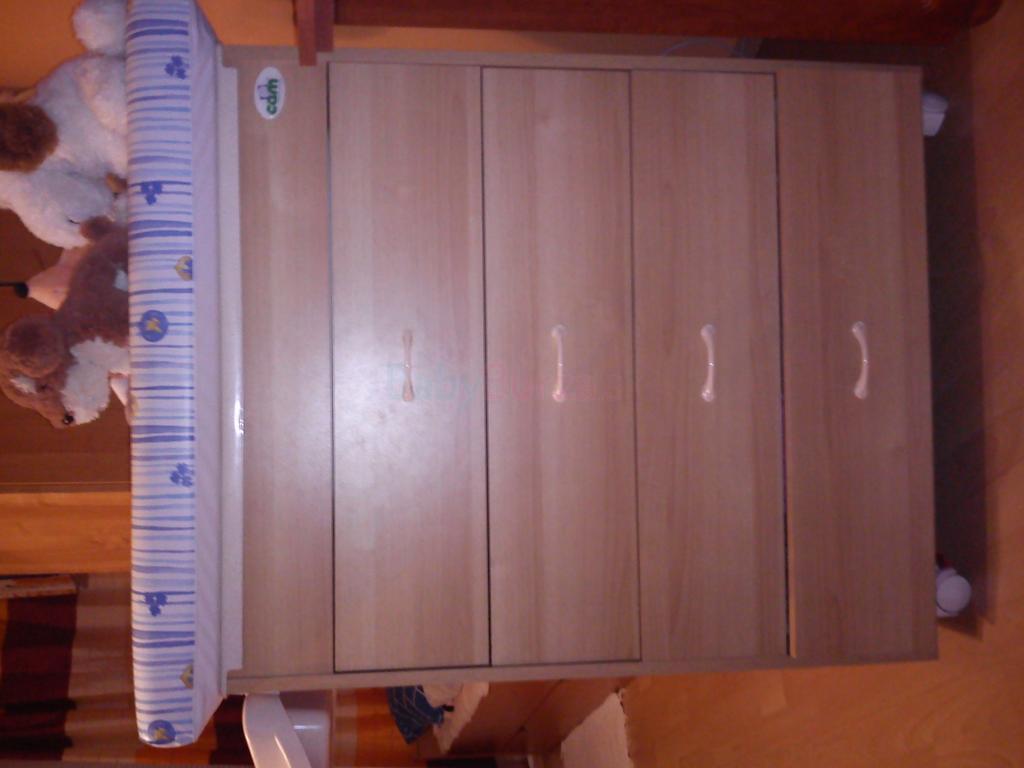 Ponúkam k predaju komodu s prebaľovacím putom a vaničkou priamo v komode. Ako je vidno z obrázku je ukrytá pod prebaľovacím pultom. Dieťatko možno okúpať a priamo na prebaľovacom pultíku oblieccť. Všetky veci sú po ruke v šuflíkoch ktoré sú štyri. Komoda je na koliečkach, čo umožňuje ľahkú manipuláciu. Rozmery: 97x44x80 + 20cm odnímateľný držiak na kozmetiku pri kúpaní.