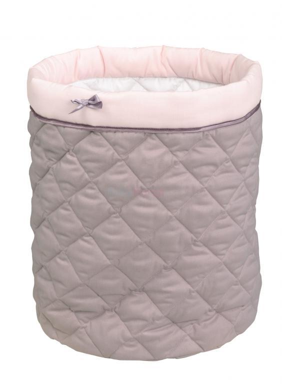 Prešívaný textilný košíček určený pre hračky, kozmetiku a iné potrebné veci. Vnútri je umývateľné PVC. Ozdobná kytička. Výška 37 cm a priemer 30 cm.